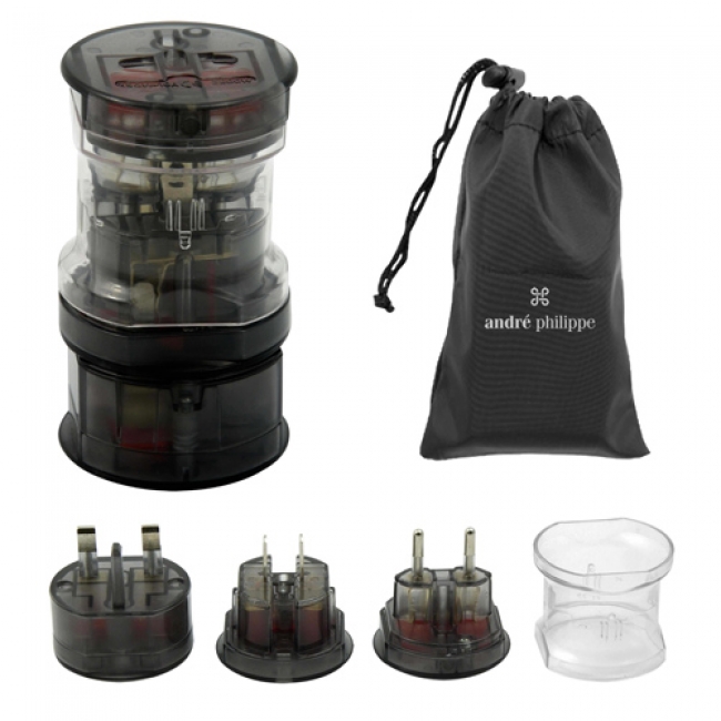 Adaptor voiaj Andre Philippe cu saculet din nylon personalizat.Se livreaza in cutie neagra cadou.