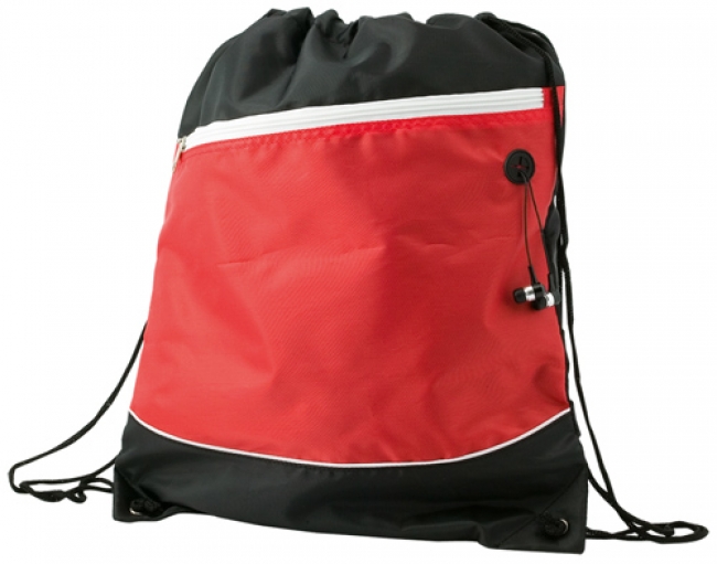 Rucsac din polyester 210T cu buzunare extra prevazute cu fermoar si orificiu pentru scoaterea castilor.