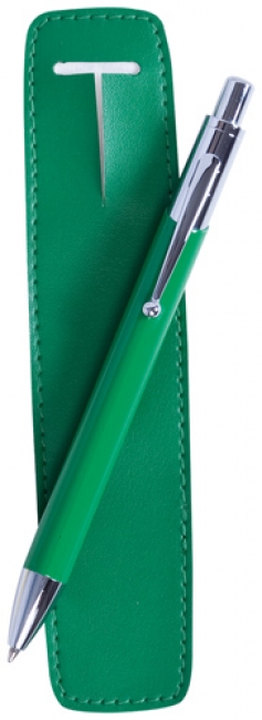 Pix metalic, colorat. În cutie din înlocuitor piele de culoarea pixului.Mină albastră.