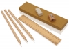 3 creioane, 1 riglă, 1 ascuţitoare, 1 gumă de şters. În cutie din carton.