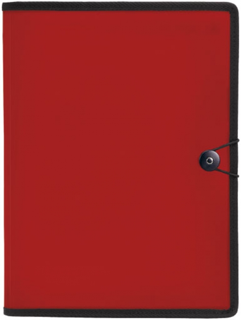 5-section accordion-style file on left side with bungee cord detail closure on flap, additional pockets on interior and paper pad included
