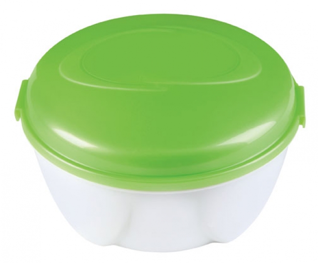 4-cup salad bowl. Freezer gel veggie tray. Separate dressing container that fits into gel tray. Domed cover with locking tabs to keep lid closed