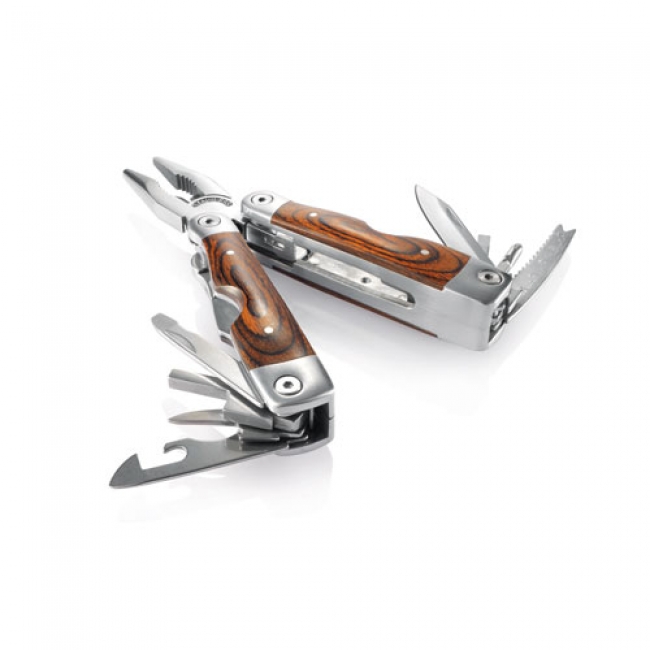 Multi-unealta cu maner de lemn Are 16 functii, confectionata din inox cu maner de lemn. Include saculet si 10 piese mici montabile.