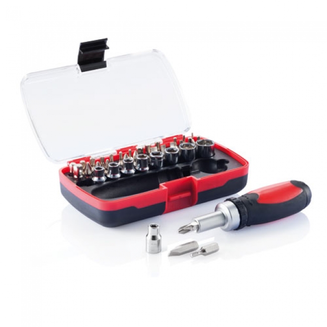 Acest set include 28 de varfuri din otel carbon, 9 piese pentru insurubat piulite, 4/4,5/5/5,5/6/7/8/10/12 mm. Otelul carbon este cromat, tratat, surubelnita are maner rosu / negru si vine impachetat intr-o cutie transparenta.