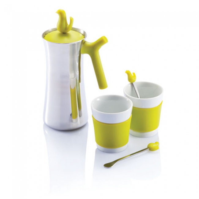Acest set de cafea iti da startul zilei in 2. Cu o capacitate de 350ml a presei de cafea, poti sa-ti mai torni lejer inca o cafea dupa ce ai baut-o pe prima. Vine si cu 2 lingurite decorate cu pasari. Setul este alb cu accente de lime.