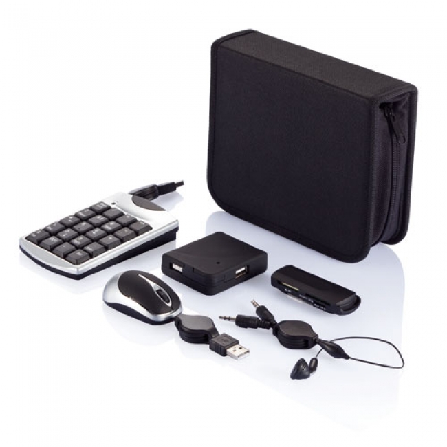 Saculet negru cu fermoar din poliester 600D cu compartiment pentru CDuri in fata. Contine : mini casca si microfon, mini hub USB cu 4 porturi (USB 2.0), mini mouse negru cauciucat, 800 dpi, mini tastatura cu linie extensibila si cititor multi-card compatibil SDHC.