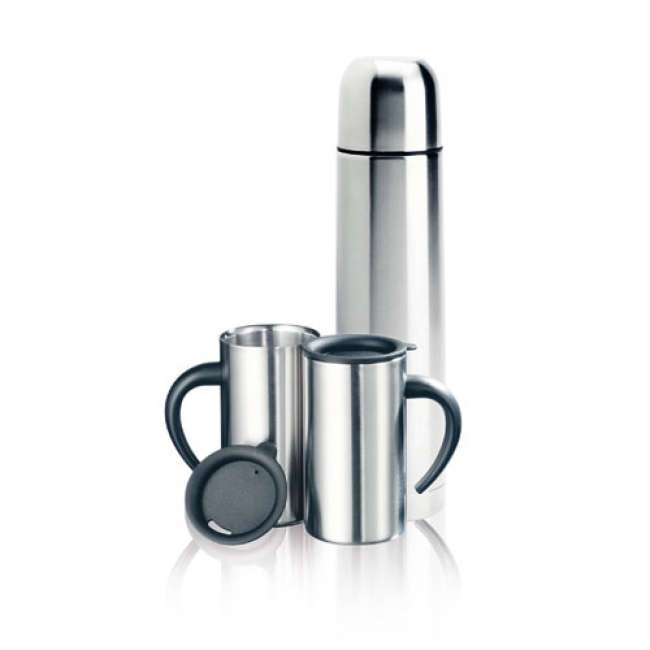 Set termos de calatorie Termos de 500ml cu perete dublu vidat din inox, cu buton pentru inchidere si 2 cesti de 300ml cu perete simplu din inox. Impachetat intr-o geanta. Culoarea depinde de cea a termosului.