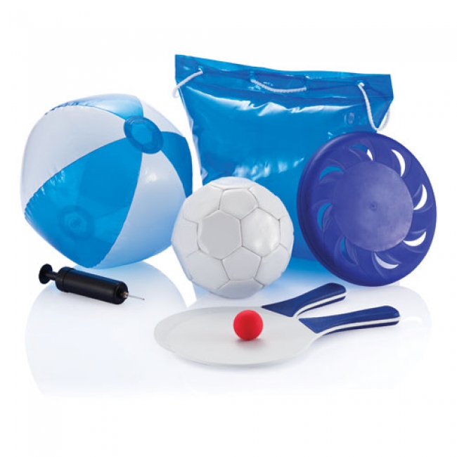 Inflatable pillow bag containing: size 3 soccer ball, plastic pump, frisbee, beach rackets and ball and 40cm beach ball.