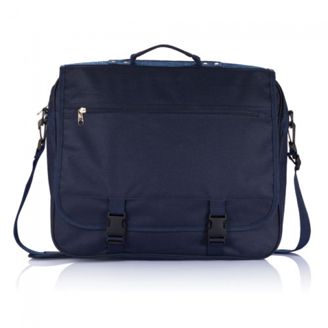 Din material 600D, 1 compartiment cu fermoar, 1 buzunarfrontal, 4 suporturi de pix, 1 loc pentru nume si curea ajustabila pentru umar.