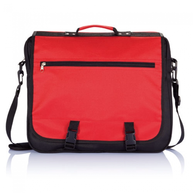 Din material 600D, 1 compartiment cu fermoar, 1 buzunarfrontal, 4 suporturi de pix, 1 loc pentru nume si curea ajustabila pentru umar.