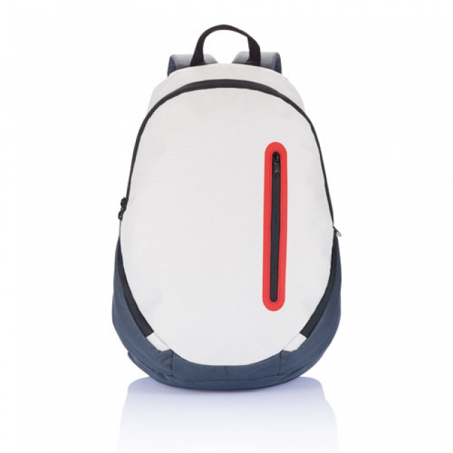 Rucsac din material 600D cu buzunar frontal cu fermoar si detaliu colorat. Mai sunt 2 buzunare cu fermoar pe o parte si inca un compartiment principal.