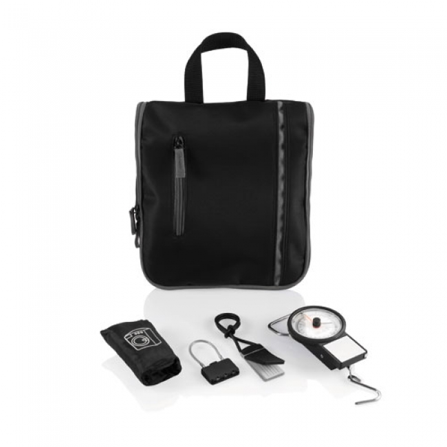 Set de calatorii Business Geanta cosmetica facuta din microfibre captusita, cu detaliu din piele gri suede, 6 compartimente, include carlig din metal, geanta pliabila de haine, lacat de calatorii, eticheta de bagaj si cantar pentru bagaje.