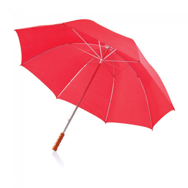 Umbrela de golf manuala din poliester 210T, cu maner metalic, spite duble metalice, varfuri din material PP, parte metalica superioara si un maner din lemn.