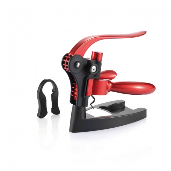 Deschizator de sticle Executive Deschizator sticle cu mecanism facut din aluminiu cu finisaj metalic rosu, spirala acoperita cu Teflon in cutie de cadou cu stativ din ABS si cu cutit pentru folie integrat.