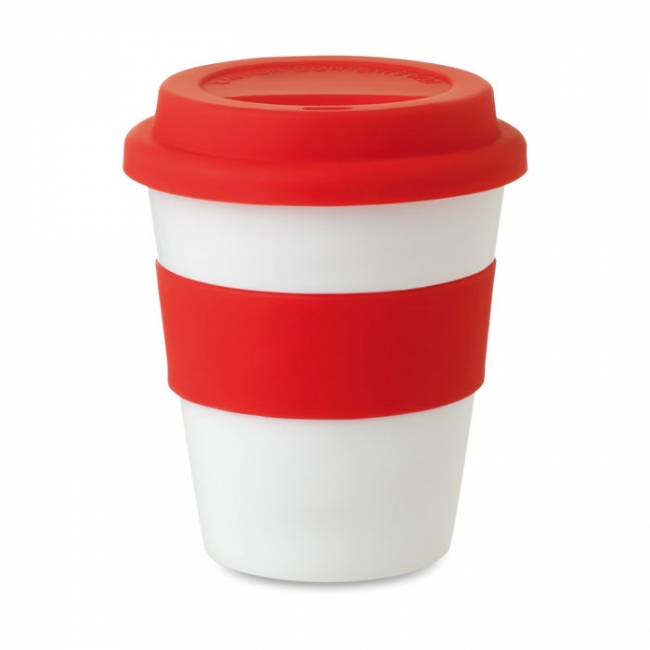 Pahar cu un singur strat în PP lucios cu capac din silicon şi inel median. Capacitate 350ml.