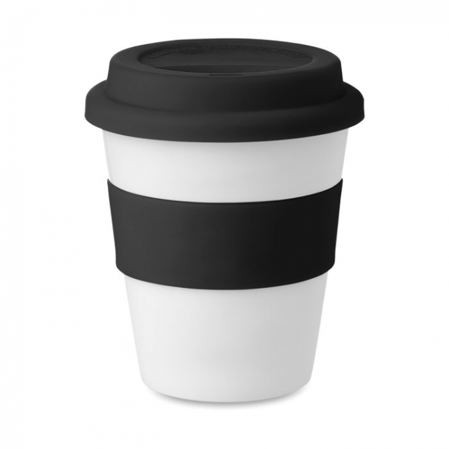Pahar cu un singur strat în PP lucios cu capac din silicon şi inel median. Capacitate 350ml.