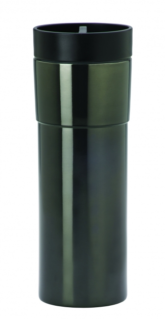 Stylish dual-wall stainless steel tumbler. Leak resistant twist mechanism.