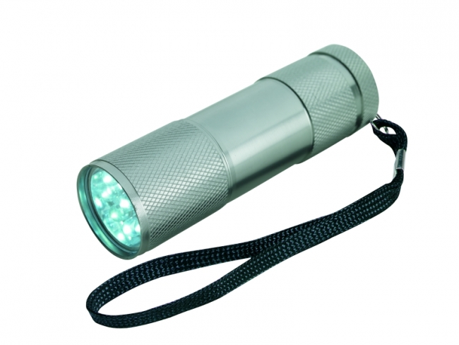 9 LED flashlight, with comfortable wrist strap and push button mechanism.