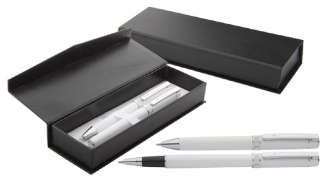 Set pix şi roller din aluminiu. Corp lucios, elemente de decor din aluminiu mat. În cutie neagră de cadou. Mină albastră.