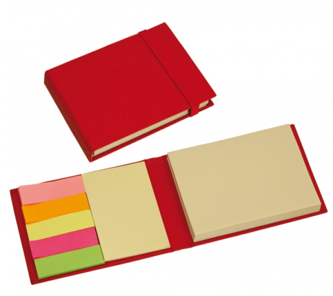 Bloc notiţe adezive, copertă din carton reciclabil. Conţine 3 dimensiuni de notiţe: 90 buc de 10 × 7,5 cm; 30 buc de 7,5 × 5 cm; 100 buc de 5 × 1,6 cm.