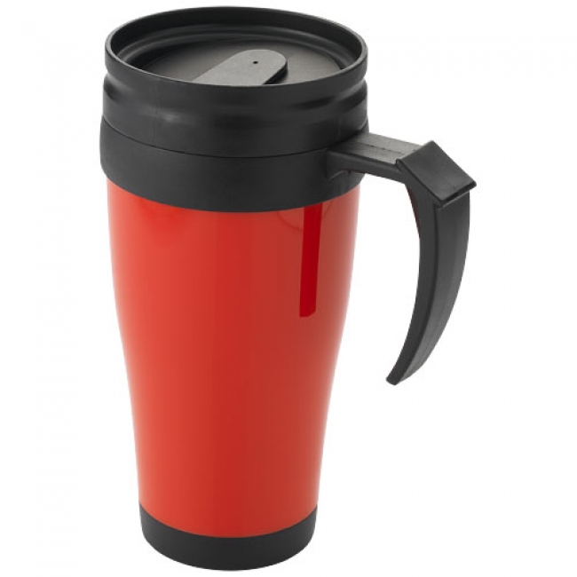 Daytona isolating mug. Double wall mug with twist-on thumb slide lid. Volume capacity is 330 ml. Plastic. Cannot be used in microwave and is not dishwasher safe. Recommended to hand wash only. Content is 330ml. Screw on thumb-slide lid
