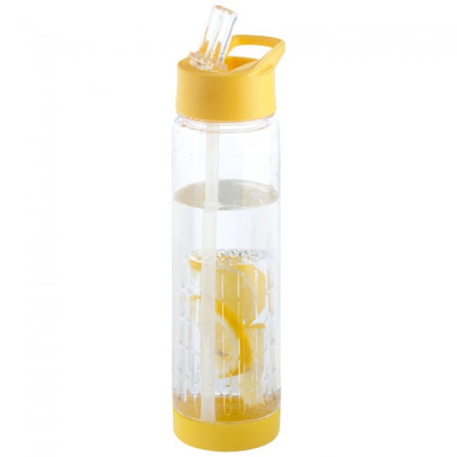 Tutti frutti bottle with infuser. Bottle with twist-on lid with flip-top drinking spout. Includes twist-on fruit infuser to add flavor to your favorite drink. Base twists off for access to infuser and easy cleaning. Volume capacity is 740ml. BPA free tritan.