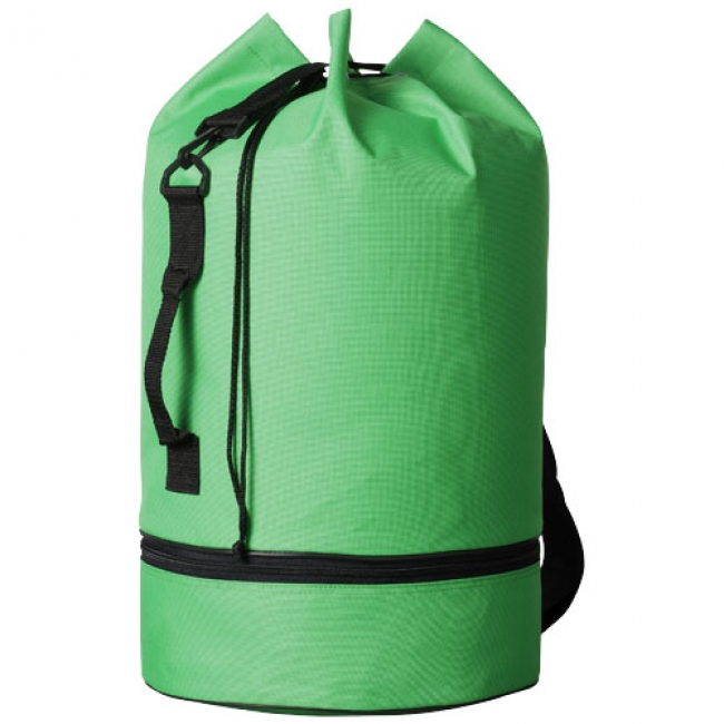 Idaho sailor bag. Duffel bag with drawstring closure, side handle and adjustable shoulder strap. With separate zipper bottom compartment. 600D polyester. PMS code: Bright green Hexachrome.