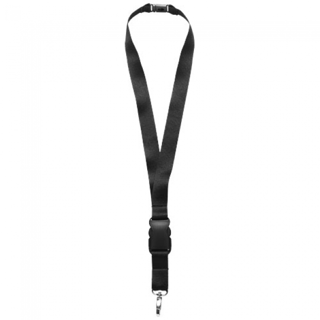 Lanyard with detachable buckle. Lanyard for holding a name badge, ID card or keys. Easily detachable buckle and breakaway closure, which is required by EU law and eliminates chocking hazards. Second location setup charge waived if both sides decorated with same artwork. Run charges still apply. Polyester.