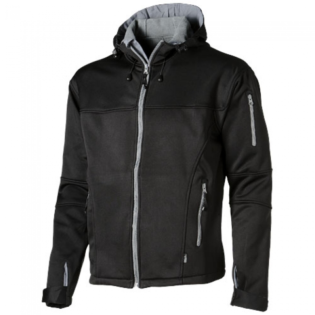 Match softshell jacket. Waterproof soft shell jacket. Breathable. Adjustable hood with elastic cord and stoppers. Front and sleeve pockets with reversed zipper. Adjustable cuff with flap with velcro closure. Drawstring at bottom with cord stoppers. Back is longer than front. Slazenger rubber label at the front. Single jersey knit of 100% Polyester bonded with 100% Polyester micro fleece. 360 g/mý