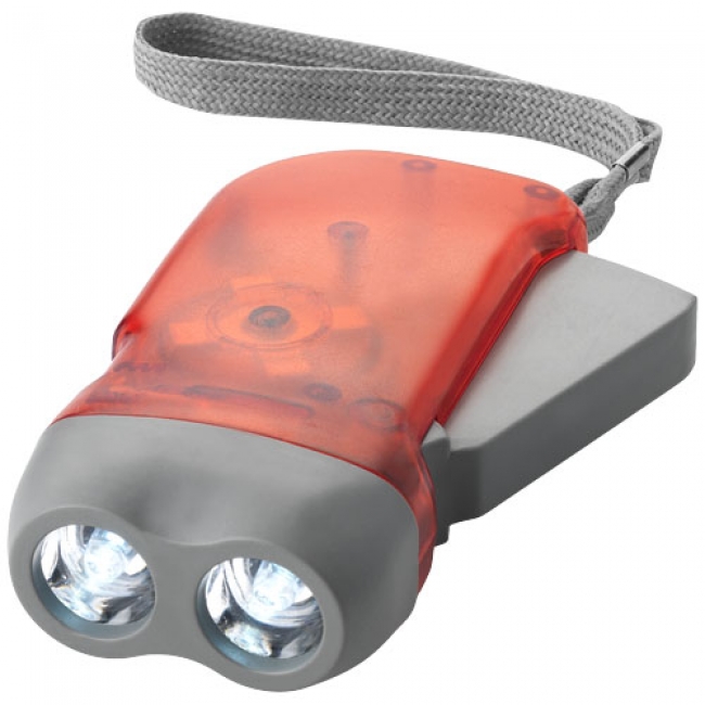 Virgo dynamo torch. 2 white LED dynamo torch with on/off power switch, lockable push charging mechanism and arm strap for multiple use. Batteries included. ABS Plastic.