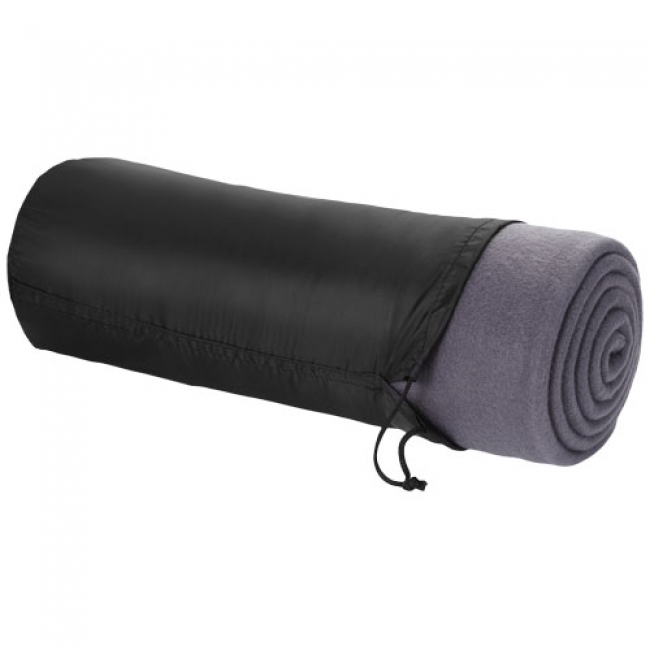 Blanket. Blanket with handy pouch and drawstring closure. Blanket size is 150 x 120 cm. Decoration on pouch only. 200 gsm polyester fleece.