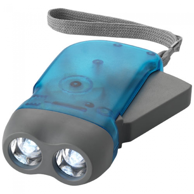 Virgo dynamo torch. 2 white LED dynamo torch with on/off power switch, lockable push charging mechanism and arm strap for multiple use. Batteries included. ABS Plastic.