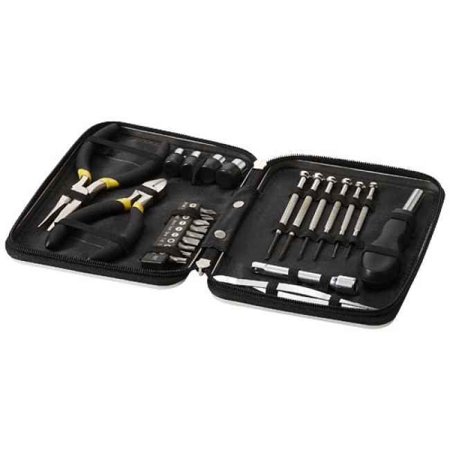 24 piece tool set. 6 screw drivers, 10 bits, connector, 4 sockets, 2 pliers and tweezers combined in a tin tool box. Metal. 5 Precision screwdrivers