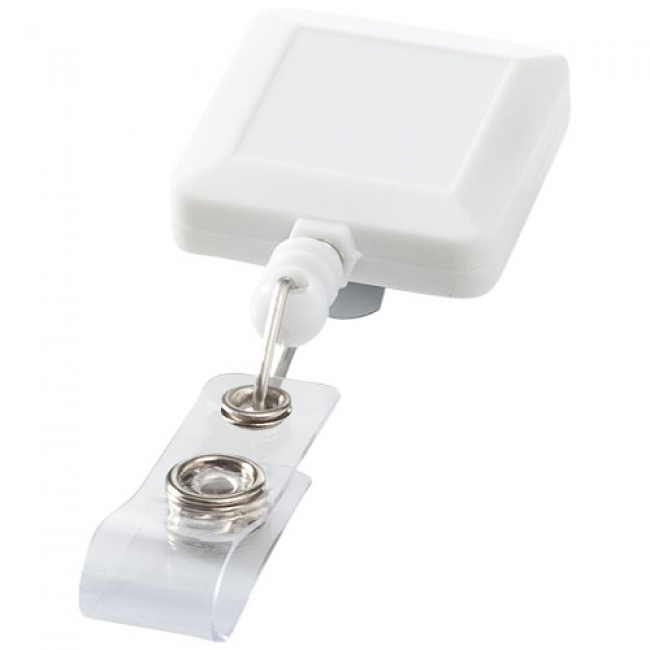 Square roller clip. Never loose your badge. Can also be used as a key ring holder. Plastic.