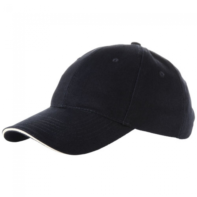 Challenge 6 panel sandwich cap. Heavy twill cotton. Contrasting sandwich color. Comes with a metal closure. Cotton. The sandwich color is "off-white"