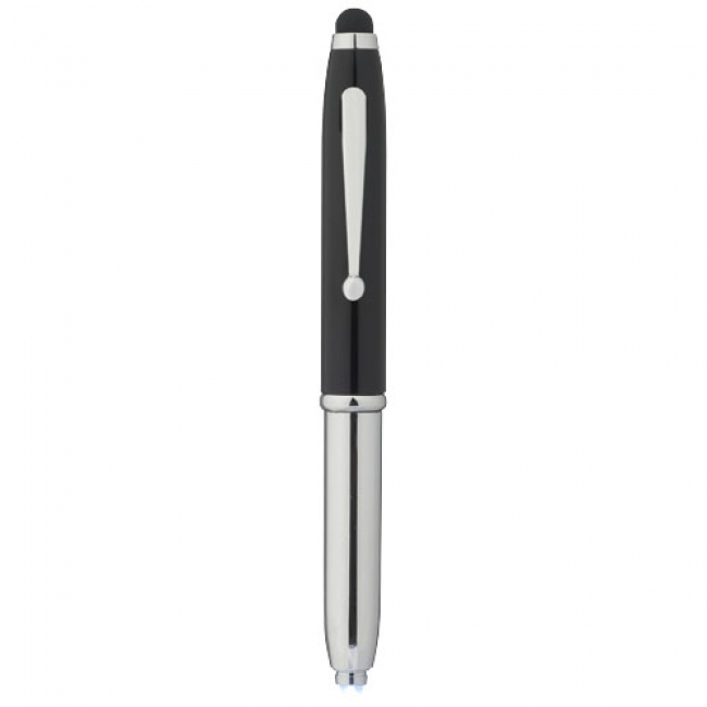 Xenon stylus ballpoint pen. Stylus ballpoint pen with single LED flashlight and removable cap. Batteries included. Metal.