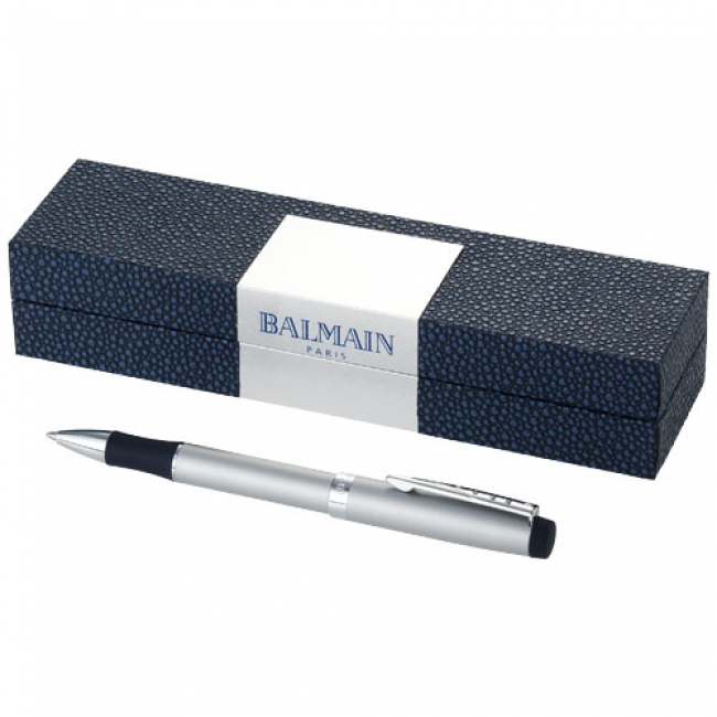 Ballpoint pen. Exclusive design ballpoint pen with soft touch grip presented in a Balmain gift box (size: 18 x 5 x 3.8cm). Metal. Ballpoint with shiny chrome underplating.