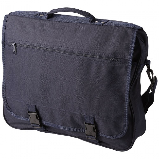 Anchorage conference bag. Exhibition bag with adjustable shoulder strap, buckle closure flap, zipper pocket in flap, zippered main compartment and several open pockets under flap. 600D polyester. This bag has a adjustable shoulder strap
