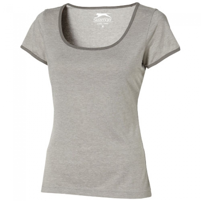 Chip ladies T-shirt. Solid colour binding at collar and cuffs. Slazenger transfer print at left lower side seam. Single Jersey knit of 65% Polyester and 35%Cotton. Weight 145 g/mý
