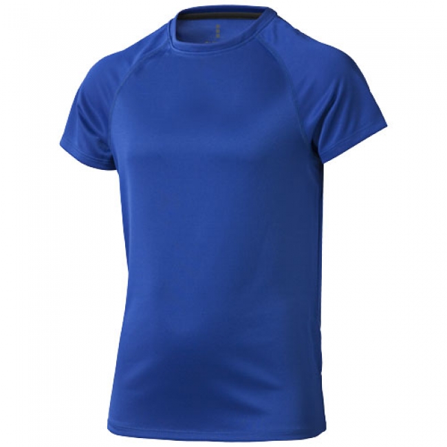 Niagara Cool fit kids T-shirt. Satin neck tape. Cool Fit. Reflective logo print at back. Thin flatlock on raglan seam. Small double needle stitching on sleeve and bottom hem. Fine quality mesh knit. 100% Polyester mesh.