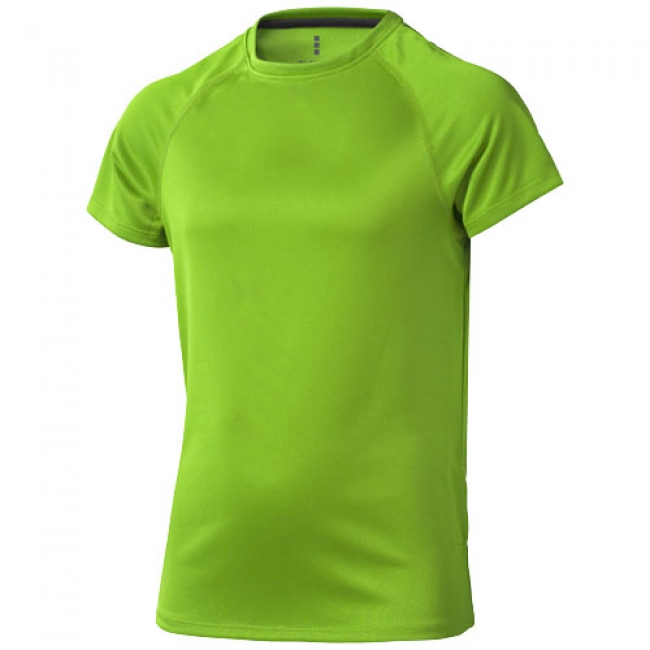 Niagara Cool fit kids T-shirt. Satin neck tape. Cool Fit. Reflective logo print at back. Thin flatlock on raglan seam. Small double needle stitching on sleeve and bottom hem. Fine quality mesh knit. 100% Polyester mesh.