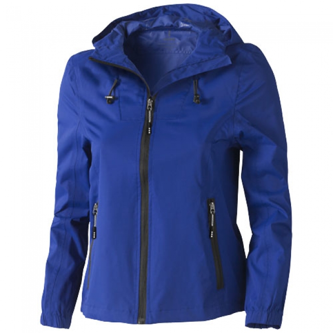 Labrador Ladies jacket. 5000/5000 Waterproof, Breathable. Visor adjustable by metal wire. Reversed zippers at centre front and in hand pockets. Elasticated cuffs. Fully tape seamed. Easy grip zipper pullers (with second set in anthracite). Inner stormflap with chinguard. Reflective logo print at back. Adjustable hood and bottom with elastic cord and stoppers. Can be worn alone or layered with the Scotia down jacket. 100% Nylon Dobby Taslon with PU clear coating.