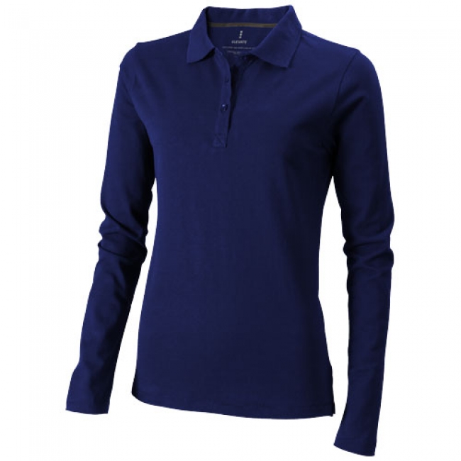 Oakville Ladies long sleeve Polo. Pre-shrunk. 1x1 rib collar. Side slit with satin tape on inside. Forwarded Shoulder seam with chain stitching. Tonal logo print at back. Mens 2 button placket, Ladies 3 button placket. Logo engraved buttons. Pick-Stitch details. Satin neck tape. 100% Cotton Piqu‚. 200 g/m2