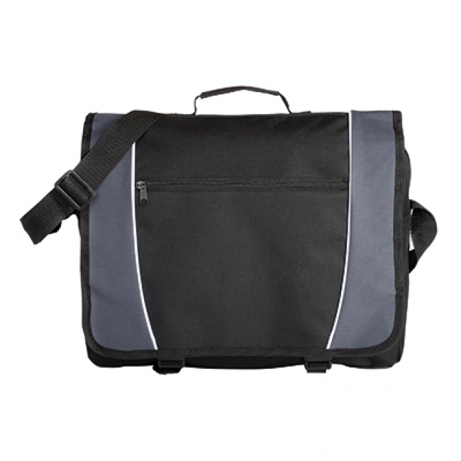 Laptop messenger with large zippered main compartment, front flap pocket and buckle closures.