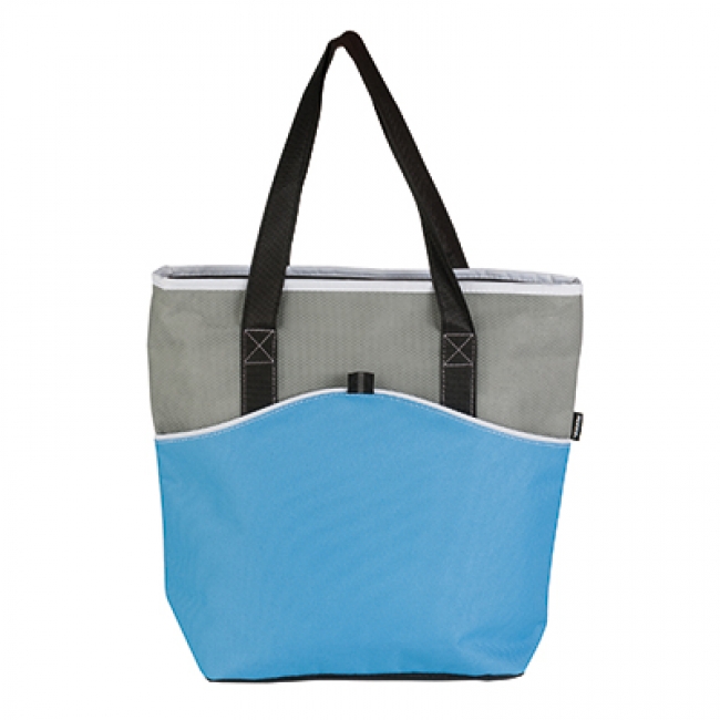 Non-woven shopping tote with insulated layer inside, front pocket with hook and loop closure and shoulder length handles.