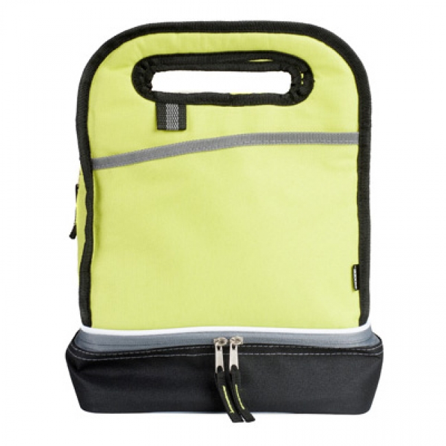 Vertical carrying cooler with two separate zippered compartments, front pocket, matching stiching zipper and polyester key ring