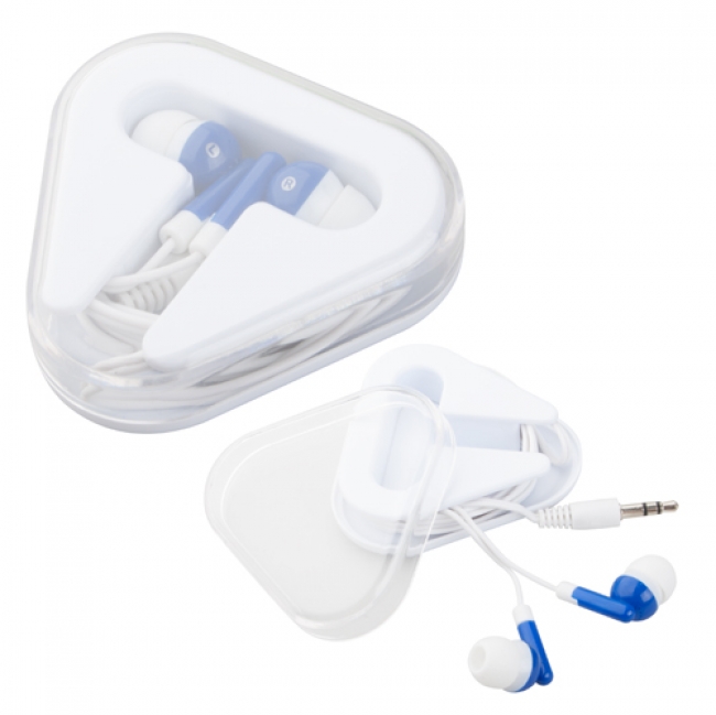 Căşti cu Jack 3.5 mm, în cutie de plastic în formă de triunghi.
