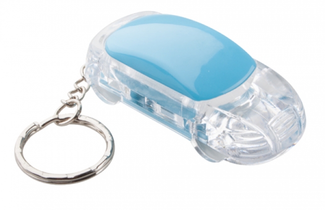 Breloc din plastic in formă de maşină, cu LED alb şi inel din metal. Baterii incluse.