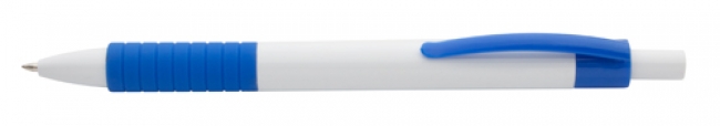 Pix din plastic cu corp alb, dispozitiv de prindere colorat si cauciucat, cu clips. Mină albastră.
