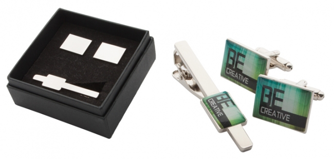 Butoniere şi ac de cravată din metal lucios, în cutie neagră de cadou. Preţul include personalizarea cu epoxy.(pe acul de cravată logo de 15 x 10 mm și pe butoniere logo de 20 × 15 mm) Cantitate minimă de comandă: 100 buc.